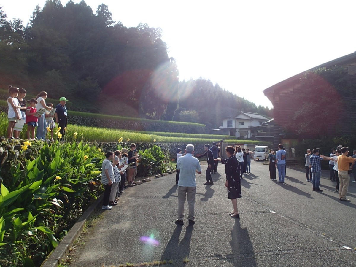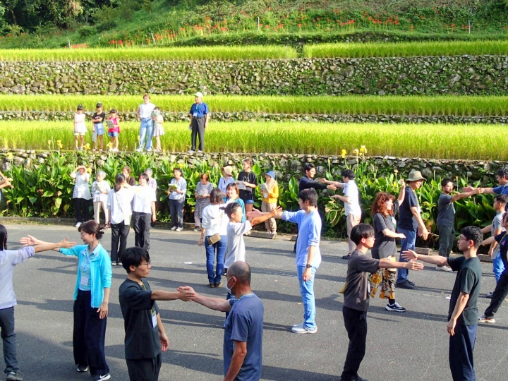 棚田と彼岸花を背景に、皆さん一緒になって一つの作品を作ります。